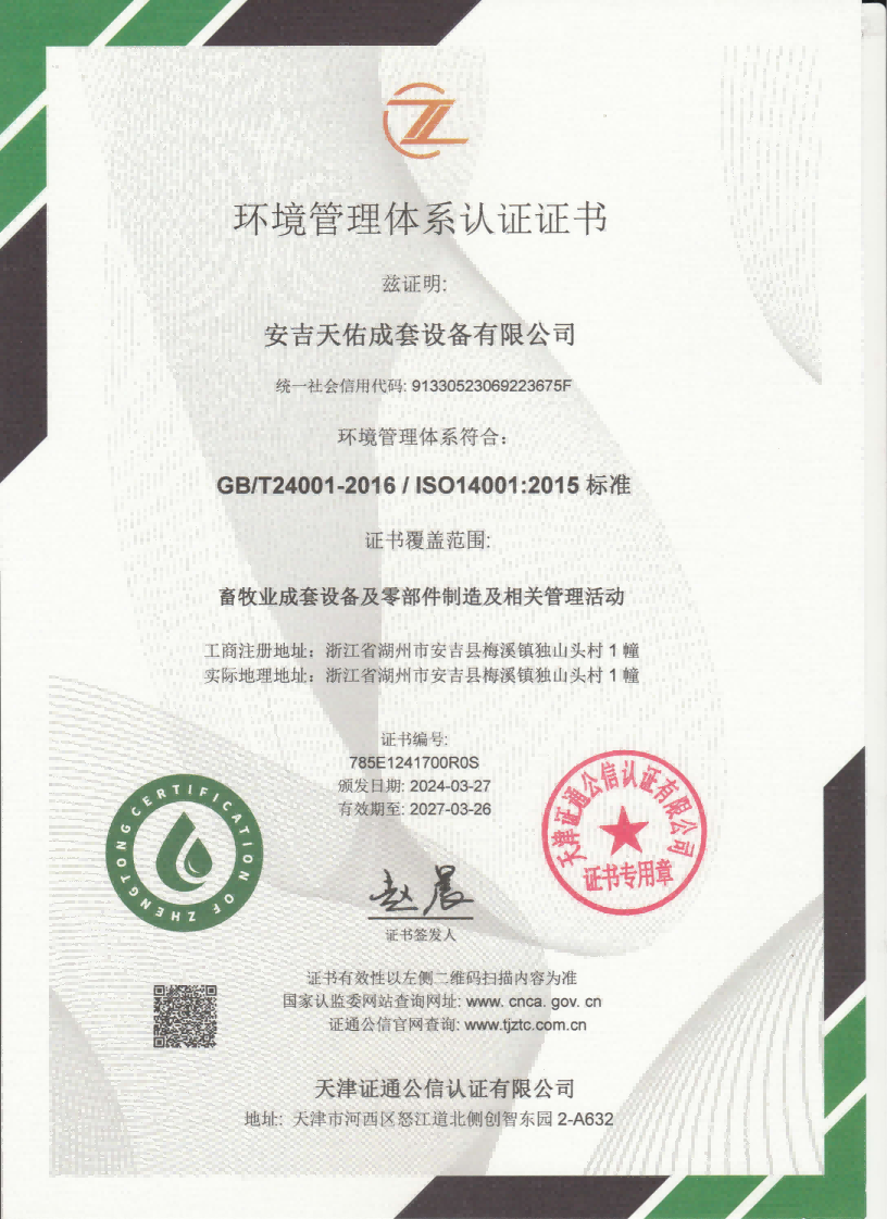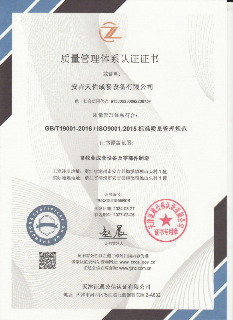 安吉天佑成套设备有限公司成立于2010年,是一家专门提供现代化畜牧场规划、设计建设和养殖设备研发、制造、安装及售后“一体化服务”企业。